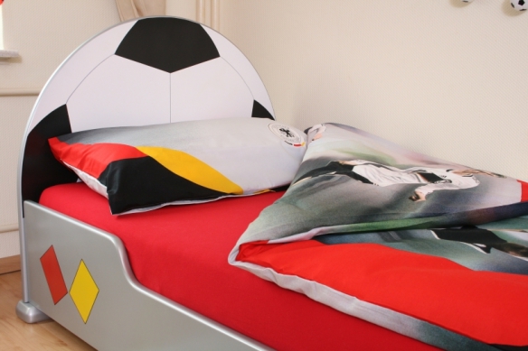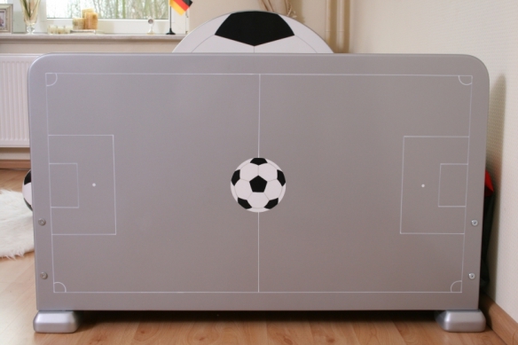 Un lit de rêve d'Oli&Niki pour les fans de foot, petits ou grands. La tête de lit est découpé en forme de grand ballon de foot et peinte en blanc et noir.