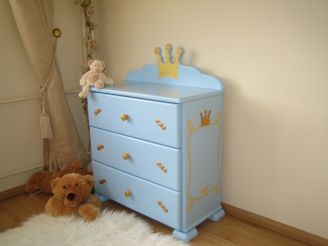 Une commode bleu ciel sur socle, avec trois tiroirs, pas que pour les princes.