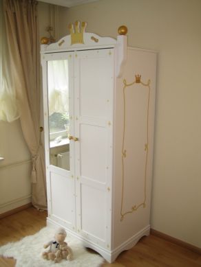Un commode de princesse, robuste, peinte en blanc, avec un miroir, et surmontée d'une couronne. Un produit exceptionnel d'Oli&Niki. A l'intérieur, d'un côté un casier et une penderie avec une tringle chromée, de l'autre 4 espaces de rangement. L'intérieur aussi est peint !!!