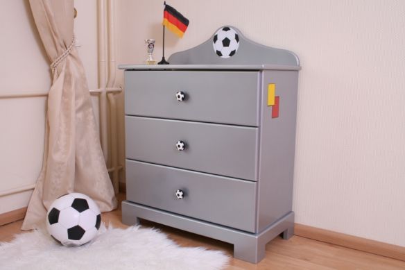 Cette commode est peinte couleur argent et les lignes de son caisson sont droites comme un but ! Sur les côtés, un carton rouge et un carton jaune, comme sur le lit. Le boutons de tiroir en forme de ballon de foot sont en caoutchouc dur et le support en plastique. Nous avons comme toujours veillé à ce que tous les détails soient bien coordonnés.