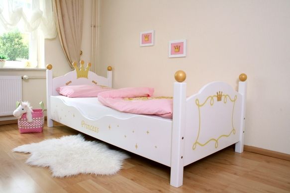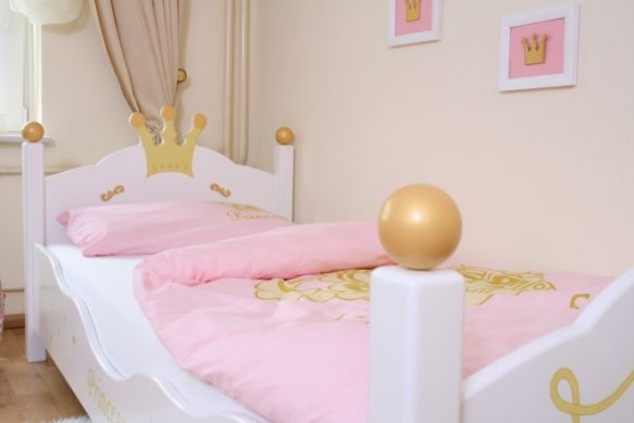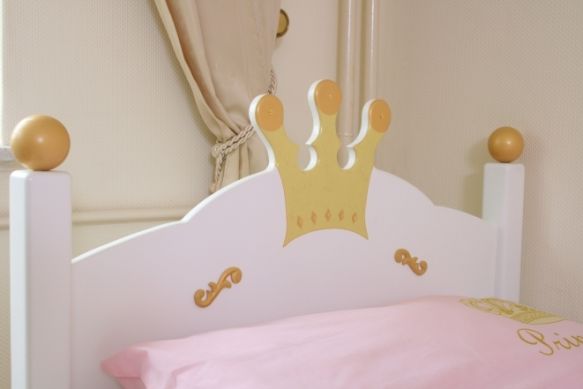 La tête du lit de princesse d'Oli&Niki est découpée en forme de courronne, peinte en jaune, avec une finition scintillante et des paillettes dorées. Le pied de lit est décoré d'un ruban. Vous pouvez, sur demande, faire rajouter le prénom de votre petite princesse sur ce lit.